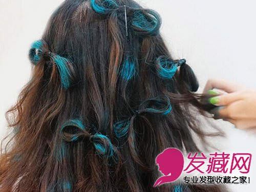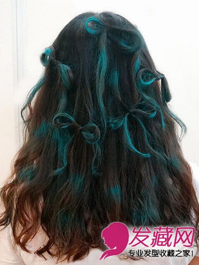 8、根据需要可以多扎几个蝴蝶结,然后使用染发蜡笔在蝴蝶结上面和下面的发梢处使用染发蜡笔补色。