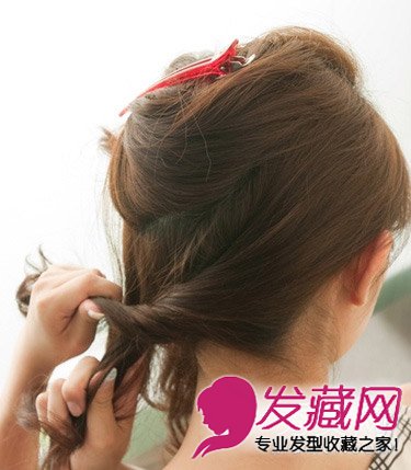step3:固定上部分头发将下部分头发扭转成发辫。