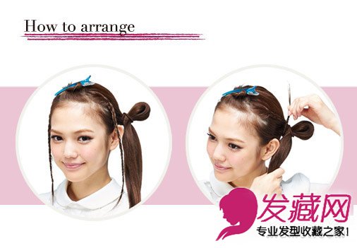 固定在头顶,分别取出两束头发编成辫子。