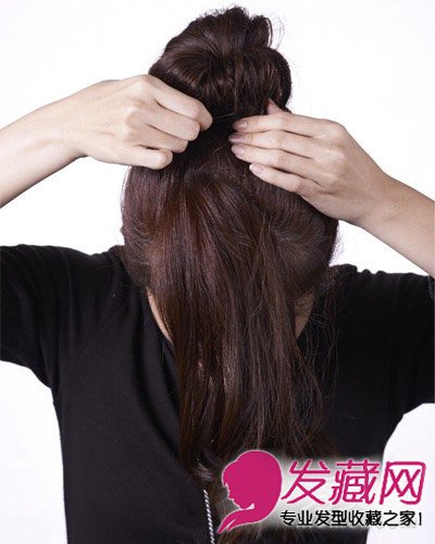 step 5:将发包放下,用黑色小发夹固定成花苞状的发髻。