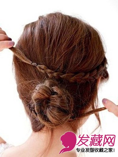 STEP3:将两侧的细发辫分别在中间发髻的上方和下方,环绕发髻用发卡固定。