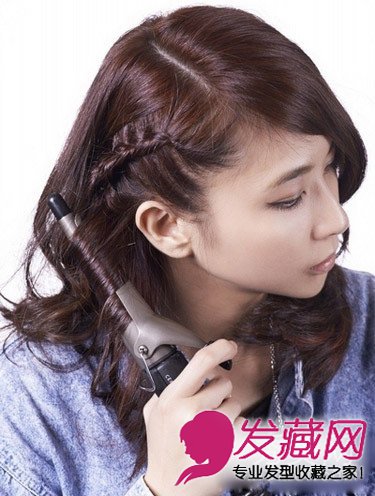 step5:再将辫子用发夹固定在脑后,拿出卷发棒烫卷发尾。