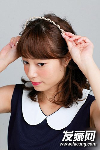 1,把两侧的头发全都别在耳后,戴上细发箍压一压。