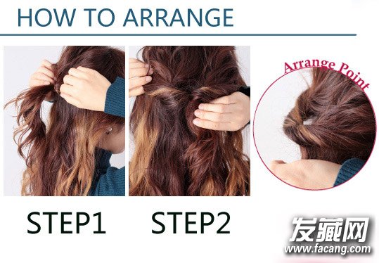 STEP 2:然后把半扎发向两侧拉开一个洞,把马尾绕过洞,再向下稍稍拉紧。
