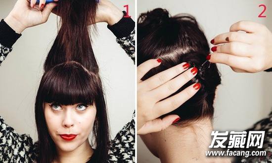 步骤二:将下方的头发绕成小包包头,用黑发夹固定。