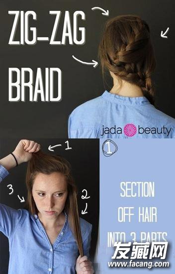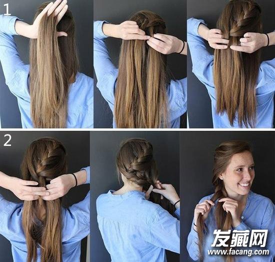 稍稍改动传统的蝎子辫,上半部分右起向左边编起,完成2/3后再向右侧继续,直至编到发尾用发圈固定。