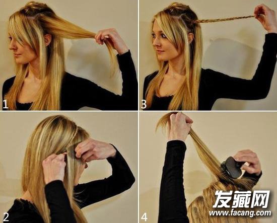 将上半部分的头发暂时向后固定,在左侧耳后取一小部分头发变成三股或四股辫至发尾,把完成的辫子绕过头顶至右侧耳后,用发夹固定,最后自然散落剩余的头发,谁能看出里面的小心机呢?