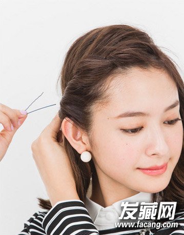 step2:将右侧的头发向后扭转成发辫并用发夹固定。