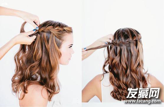 5、到后面的时候就从头顶添加新头发,用其它两股编织让其下垂。