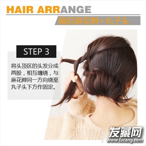 STEP 3:将头顶区的头发分成两股,相互缠绕,与麻花辫同一方向绕至丸子头下方作固定。