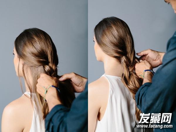 step 1:首先取出一部分头发把它们编成传统的三股辫,编织的长度是发长的三分之一。然后将余下的头发分成两份,随意缠绕到刚才盘好的三股辫中,制造混乱感。