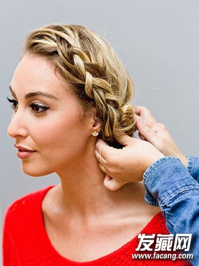 5、卷起一侧辫子的发尾,简单地盘起后用发夹固定在脖颈之上。