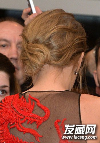 简约的低盘发略微的松散随意,霉霉将短短的卷发在背后偏斜的位置扎成一个丸子状的发髻,周围小碎发自然散落,不会让造型显得过于老气。