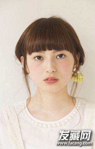 厚重的齐刘海遮盖住整个额头衬托出白皙甜美的脸蛋,两鬓轻垂下来的发束更显女人味。