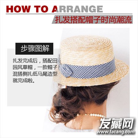 扎发完成后,搭配田园风草帽,一款帽子混搭侧扎低马尾造型就完成啦。