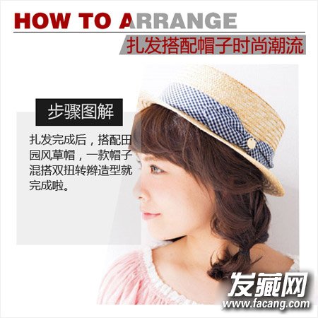 扎发完成后,搭配田园风草帽,一款帽子混搭双扭转辫造型就完成啦。