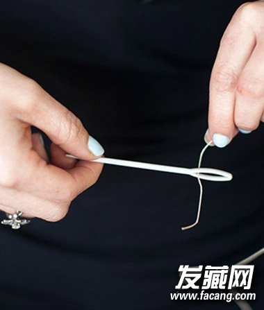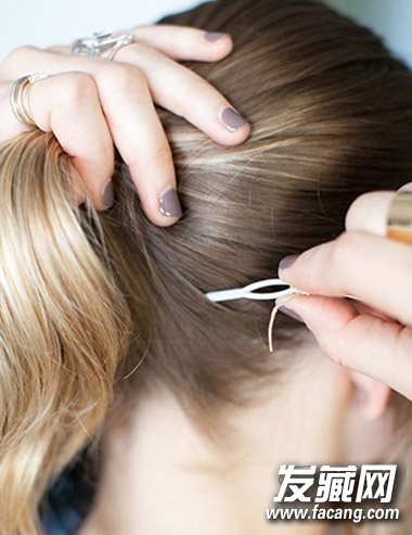 2.将所有的头发聚集起来,在中马尾的位置用左手握住,将毛衣针从右端穿进下方中央位置的头发层,记得在末尾处留出5-6cm的线。