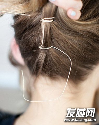 6.左手继续抓住马尾,让它的“尾巴”自然下垂,如图所示,将线绕过“尾巴”的中部穿进头发层内。