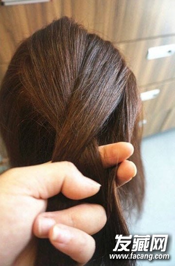 3、右边再取一缕头发,与刚刚交叉过来的左侧头发合并。