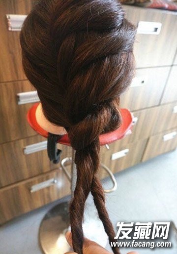 8、待头发全部编好之后,从后脖子的头发开始,往反向拧转。
