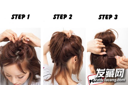 step 3:将侧边头发固定在发髻前,让造型更加别致,下面剩余头发层次向上固定,让发尾向上翘起,围绕发髻就完成。