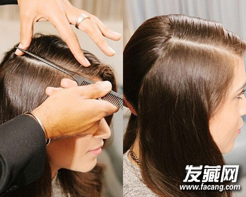 因这款发型特别重视发界线,用梳子尾端拨均发丝,分出一条笔直明显的线条,再将两侧的发丝打理服帖。