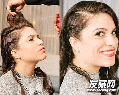 完成好左侧编发和后脑勺部分的卷发打理工作后,将刘海吹干抓蓬松,喷上发胶喷雾让刘海定型成S型。