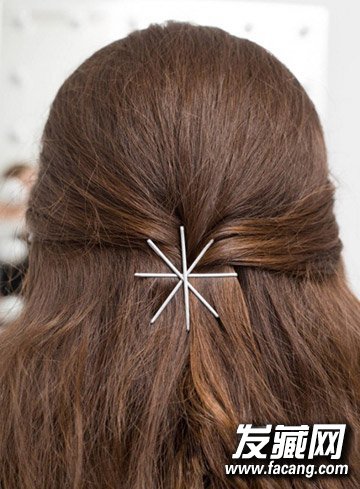 优雅的公主头也可以通过发饰的不同有不一样的感觉,利用简单的发夹先从横向固定,再逐一夹出星形就完成。