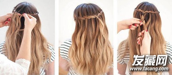 1、按照上面的编发过程,在瀑布辫交叉处编出三股头发,越过中间,让左右两股交叉。