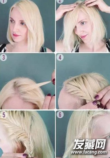 这是既解决额前发又翻出新花样的一招,将头发侧分后,两侧分别如图编织。1.左侧编织成一条层叠状的鱼骨辫,右侧编织出两条三股辫。编织完成后绕到耳后,用小皮筋固定,将上半部分的头发用发夹夹起,放置在辫子之上,盖住小皮筋。2.最后用卷发棒卷一下发尾,整个造型更随性灵动了。
