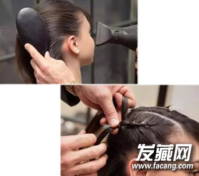Step 1:在右侧的头发上抹上摩丝,用猪鬃梳进行梳理,并用吹风机辅助,让它更顺滑服帖,有助于后续的编发。