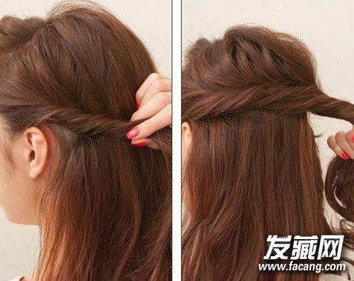STEP5:从左侧耳朵上方的位置开始抓一束头发开始扭转。
