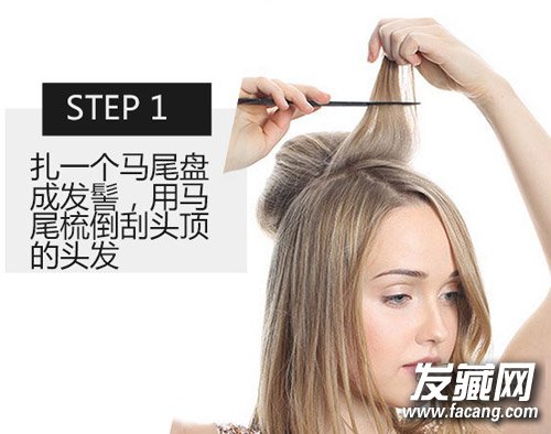 step1:在后脑勺扎一个高马尾,盘成一个高髻,将高髻前方3厘米左右的头发用尖尾梳倒刮蓬松。
