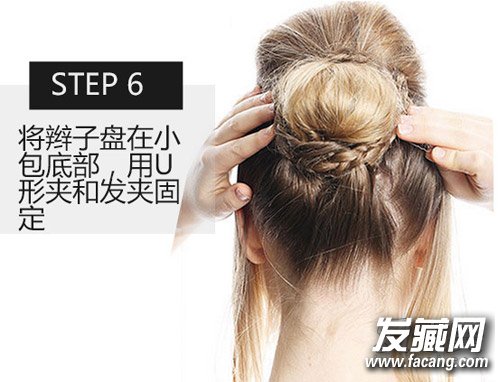 step6:将三个辫子一次盘在小包的底部,并用发夹固定。
