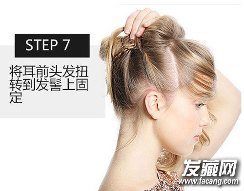 step7:将耳前——太阳穴后的头发向后上方扭转固定,发尾藏在两个发髻之间。另一边也是这样。