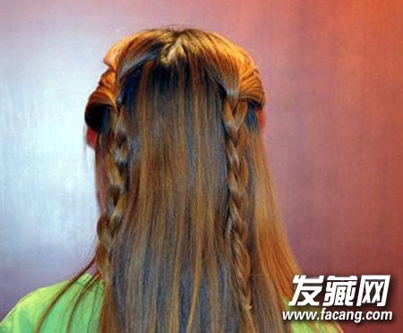 1、先在头顶两侧梳两个对称的麻花辫~末端用橡皮筋扎好。