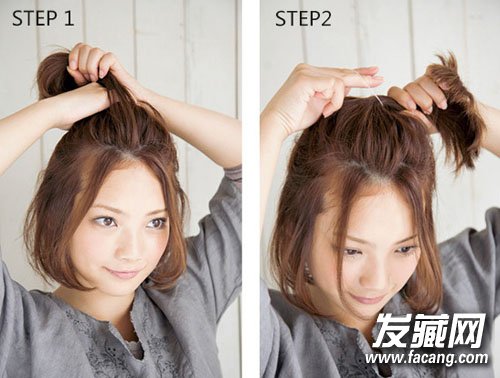 step1:在手上喷上定型发胶,用双手将发胶均匀涂上头顶的头发,将其收拢起来。