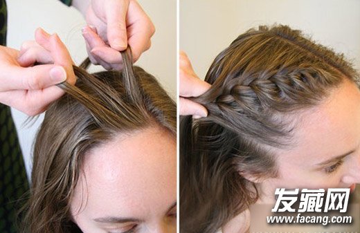 3.从开始的那一束头发开始编织的过程中,不断从剩下的U形区中加头发进去编织,以续发的形式进行编织可以更好地固定发辫的走向,发尾处用发带固定就行了。