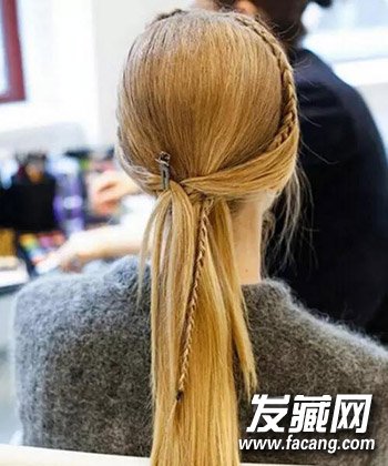 step 1:首先把头发分成前后两半部分,一部分跨越两耳向前,剩下的一半头发扎成低马尾造型。