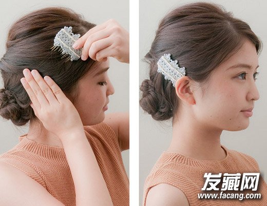 step11:将发卡从太阳穴后方斜下将插梳别好。