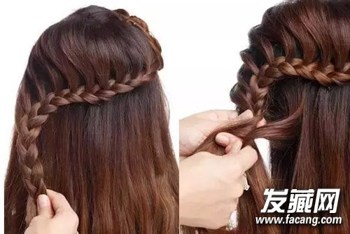 3、把每一缕头发要编干净,然后把耳侧的头发要编进来两缕。然后就要向相反的方向编,之前的三加一都是从左侧去头发,第二层的加发从右侧去头发,和第一层的编法一样,不同的是取头发的方向不一样。