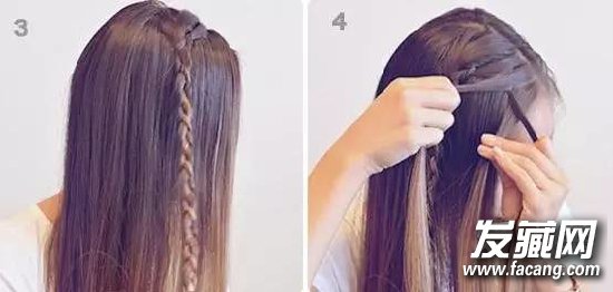 2:一直编到发尾,再从刘海处取一束头发,同样开始编三股辫。
