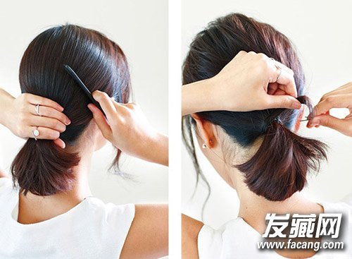 step1:用梳子将头发往后收,经马尾固定在脑后与下巴平行的的高度上。