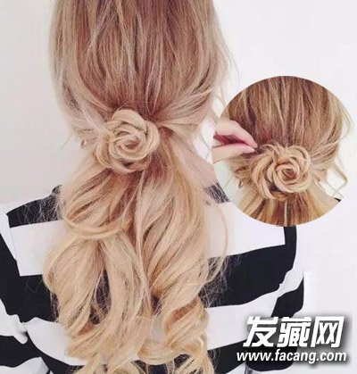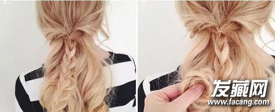 沿着透明橡皮筋扎紧的地方开始,编麻花辫,编到接近底部后固定,拉松辫子,然后从底部卷起上绕,染成一朵花的形状;