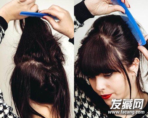 step 3:将上方的头发刮膨往后梳在和下方小包头一起用黑夹固定。
