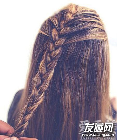 step2、将上一步骤拿起的头发分成三份,编麻花辫,编至发尾用橡皮筋固定;