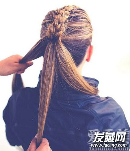 step4、将集中在一起的头发和上面的麻花辫一起扎一条马尾,扎好后依然将编好的麻花辫往头顶放一放;