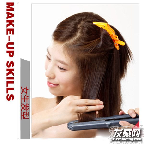 Step 3 用直板夹夹住发尾,配合手指,将发尾稍稍夹出弧度。