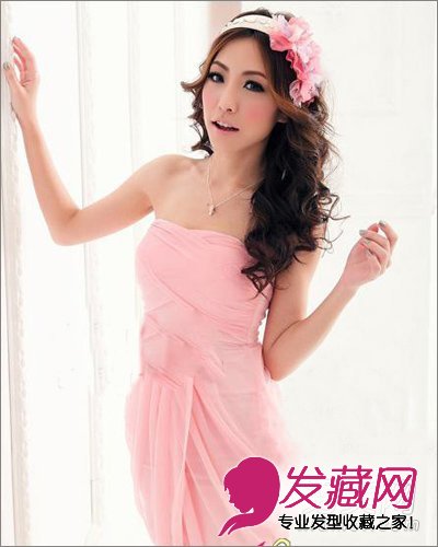,这款蓬松灵动的外卷大波浪发型,时尚优雅,搭配粉色发箍和裙子,很有高贵名媛范。