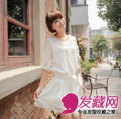 女生的盘发整体上修饰了女生的方脸脸型,将脸型衬得十分的娇小可爱,刘海处的头发修剪的十分齐整,露出了女生干洁的面额,甜甜地笑容,为整款发型带来了一种清新范,甜美可人。